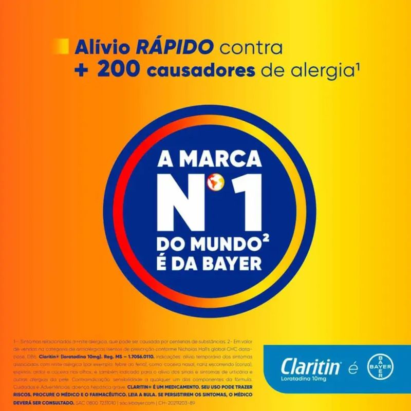 Claritin Loratadina 10mg com 6 Comprimidos – BayerO Claritin 10mg é um anti-histamínico indicado para o alívio dos sintomas de alergias, como espirros, coceira, nariz escorrendo e olhos lacrimejantes. Com 6 comprimidos, é ideal para quem busca praticidade e efeito rápido, garantindo conforto e bem-estar sem causar sonolência.