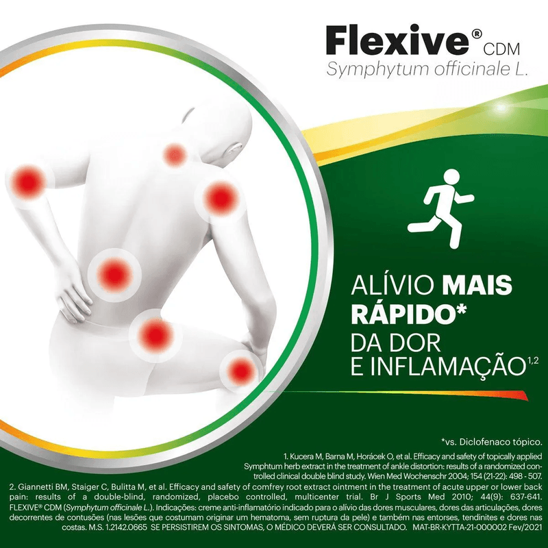 - Você não deve utilizar Flexive® CDM em presença de hipersensibilidade (alergia) ao Confrei ou a qualquer outro componente da fórmula. Flexive® CDM não deve ser aplicado nos olhos, em membranas mucosas (como boca e vagina) nem em feridas e escoriações abertas, somente sobre a pele intacta.