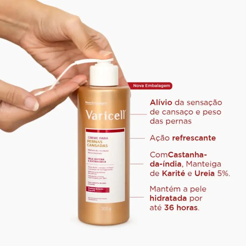 Varicell Creme Pele Extrasseca 300g é um creme hidratante para pernas, formulado com castanha-da-índia e mentol. Dermatologicamente testado e hipoalergênico, oferece ação refrescante imediata e hidratação intensa por até 36 horas.