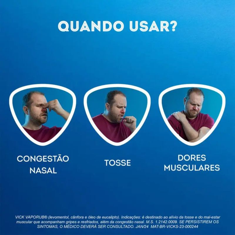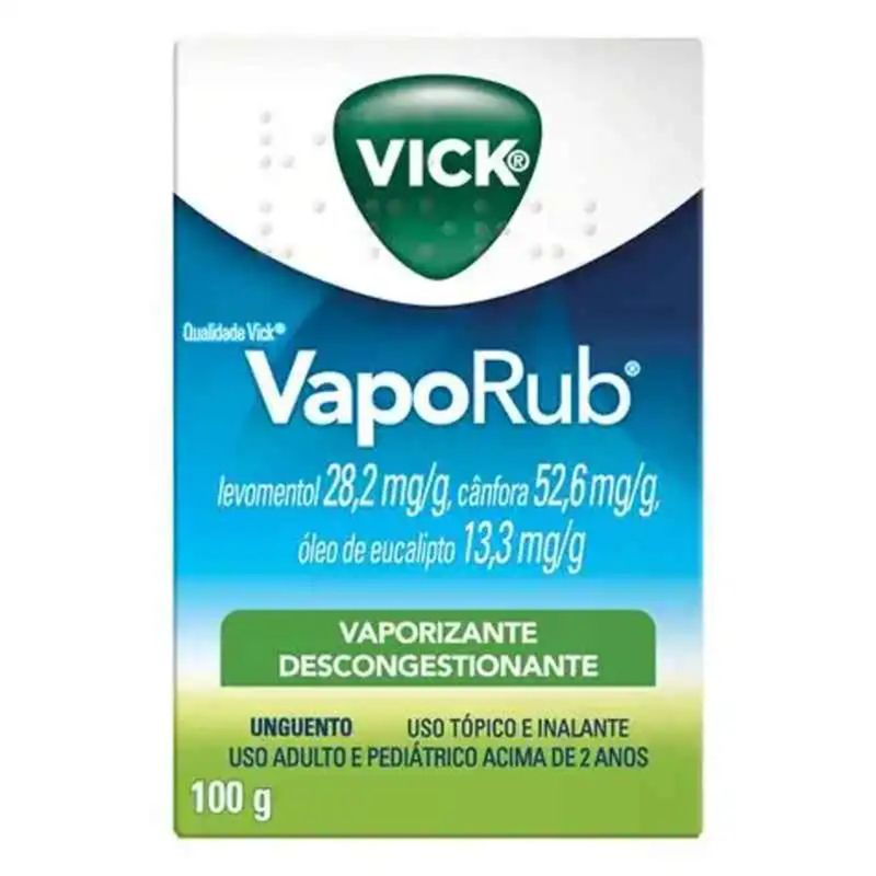 Vick VapoRub Pomada Descongestionante 100g – P&G é uma pomada tradicionalmente usada para aliviar a sensação de nariz entupido e desconfortos do resfriado. Sua fórmula com mentol, cânfora e eucalipto oferece uma ação refrescante que ajuda a facilitar a respiração. Pode ser aplicada no peito, pescoço ou costas para proporcionar sensação de alívio e bem-estar, especialmente à noite. A versão de 100g é ideal para quem busca maior rendimento e praticidade no dia a dia.